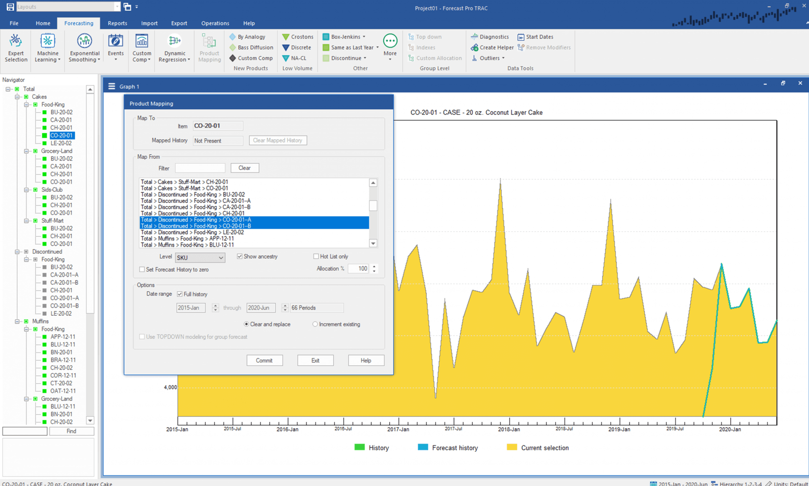 Forecast Pro enables you to map history from existing and/or discontinued items into the new items you want to forecast. Product Mapping (aka Item Supersession) is useful in a wide variety of situations including forecasting replacement products, introducing product-line extensions, transitioning to new warehouses, and many more.