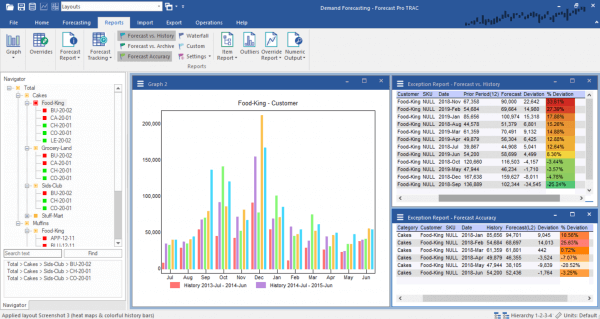 Forecast Pro’s flexible exception reporting allows you to focus on areas that need your attention. The reports are easily customizable to reflect different performance metrics ‒ such as forecast vs. history or whether forecast error exceeds a pre-defined threshold – and give you a quick way to identify potential problem areas.