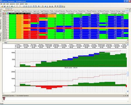The planner can then use the system to change planning parameters and capacity in each period to see the impact on deliveries, stock levels, and capacity utilization over the planning horizon.